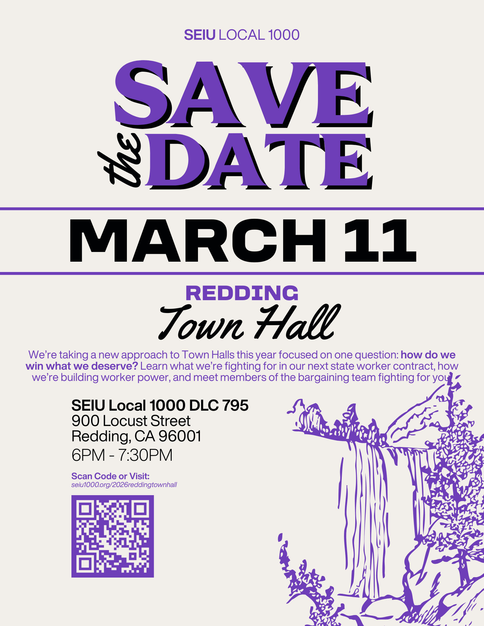 2026 Redding Town Hall Feb 9, 2026 | Event | 0 comments Join our upcoming Town Hall in Redding! DATE: Wednesday, March 11th TIME: 6 PM – 7:30 PM LOCATION: SEIU Local 1000 DLC 795900 Locust StRedding, CA 96001 Click Here to RSVP Click here to download our flyer to share with your coworkers! Submit a Comment Cancel replyYour email address will not be published. Required fields are marked *Comment * Name * Email * Website Save my name, email, and website in this browser for the next time I comment.